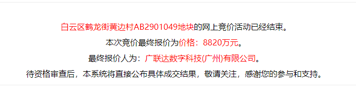 白云区鹤龙街黄边村AB2901049地块以底价8820万元被广联达竞得,折合楼面价9112元/㎡。