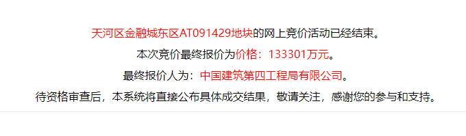 天河区金融城东区AT091429地块以底价133301万元被中建四局竞得,折合楼面价16333元/㎡。