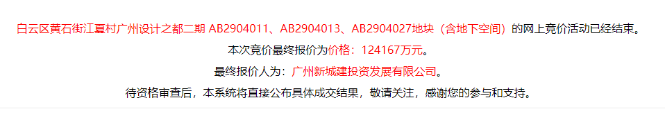 白云区黄石街江夏村广州设计之都二期 AB2904011、AB2904013、AB2904027地块(含地下空间)以底价124167万元被广州城投竞得,折合楼面价9800元/㎡。