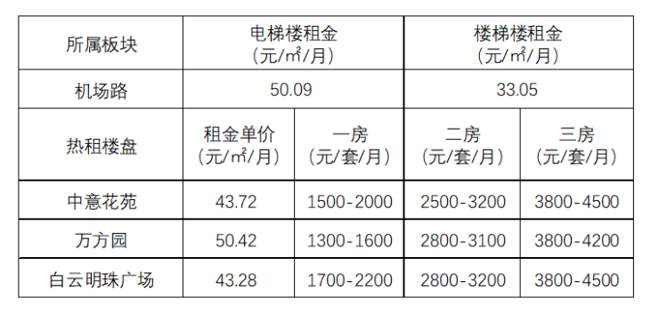 飞翔公园站乘地铁至珠江新城站约30分钟,属白云区机场路板块。7月,机场路板块电梯楼与楼梯楼租金分别为50.09元/平方米/月与33.05元/平方米/月。