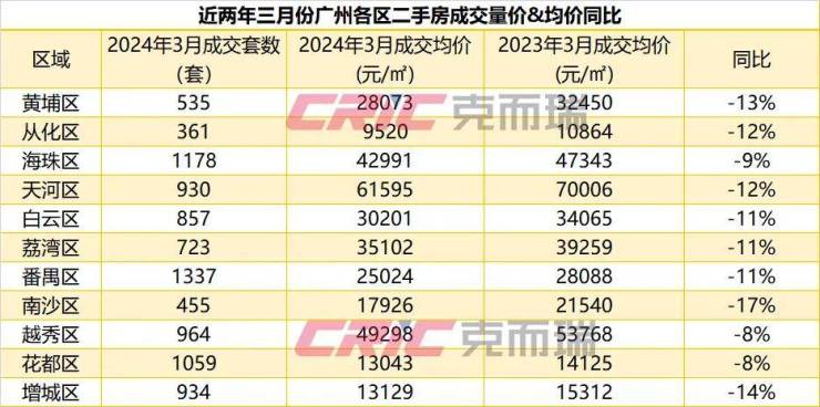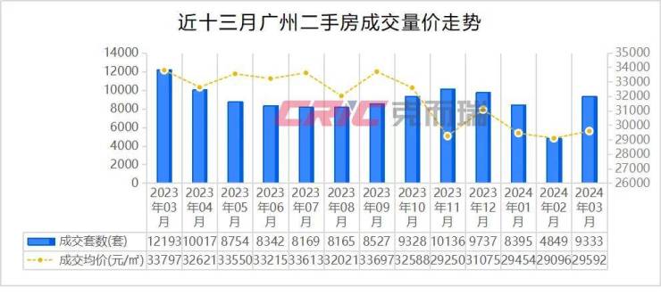 克而瑞数据监测显示,今年3月,广州二手房成交9333套,成交均价29592元/㎡,同比下跌12%。