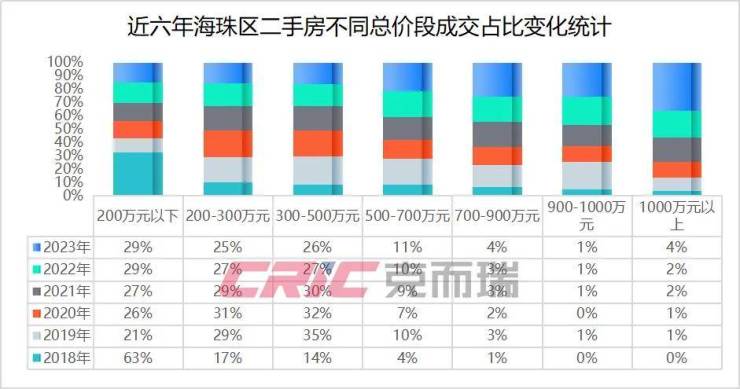 克而瑞数据监测显示,海珠区总价500万元以上的二手房2023年成交占比为20%,同比2018年提升15%;相反,总价500万以下的二手房的成交占比由2018年的94%降至2023年的80%。