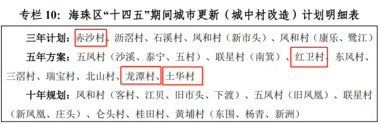在2021年7月海珠区发布的“十四五”规划中,这四个村均被纳入3-5年行动计划里。