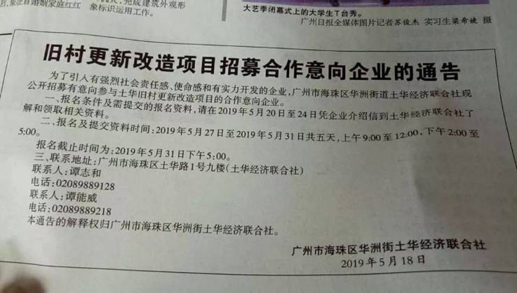 2019年5月18日,海珠土华经济联合社在广州日报主动登出《旧村更新改造项目招募合作企业的通告》。