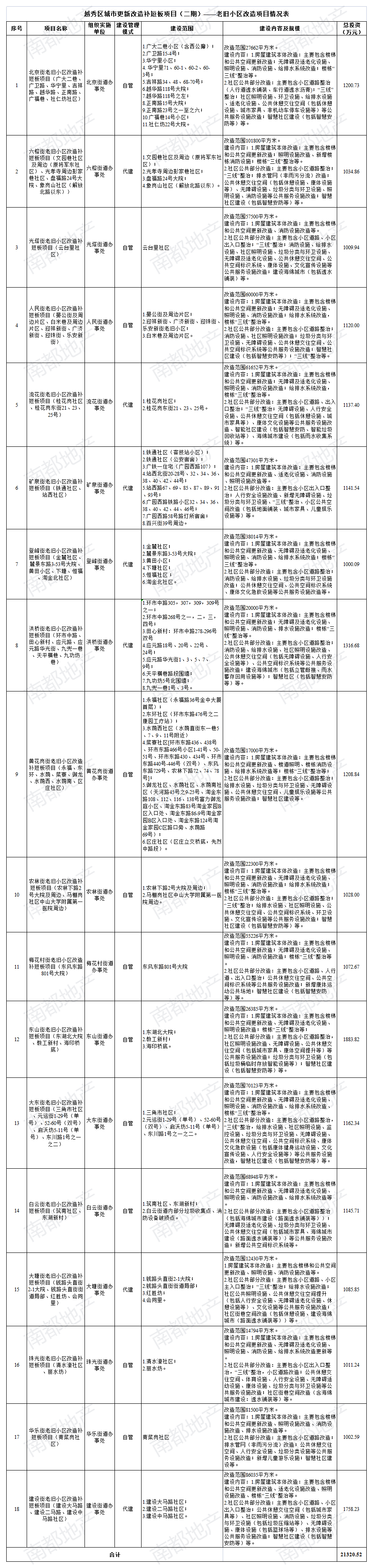 今年1月下旬,越秀区城市更新改造补短板项目(二期)已完成决策风险分析与评估、建设方案联审决策。从相关函件可见,补短板项目(二期)总投资21320.52万元,其中,工程费用17696.48万元,工程建设其他费用3205.99万元,预备费418.05万元。项目建设所需资金由区统筹资金安排解决。