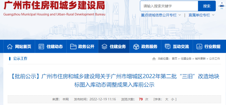 近日,广州市住房和城乡建设局发布了“增城区2022年第二批“三旧”改造地块标图入库动态调整成果入库前公示”。