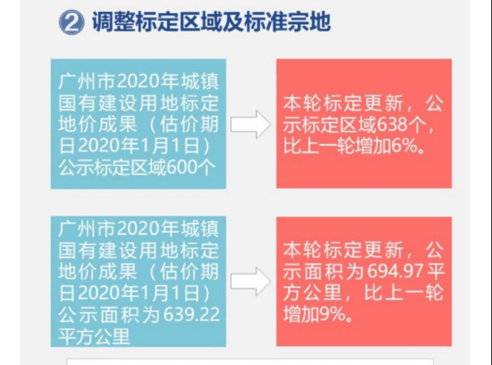 本次公布的城镇国有建设用地标定地价的公示范围为广州市越秀区、荔湾区、海珠区、天河区、白云区、黄埔区、花都区、番禺区、南沙区、从化区和增城区等十一区的规划建设区范围。与广州市2020年城镇国有建设用地标定地价成果相比,本轮公示标定区域从600个增加至638个,比上一轮增加6%;公示面积从639.22平方公里增至694.97平方公里,比上一轮增加9%。
