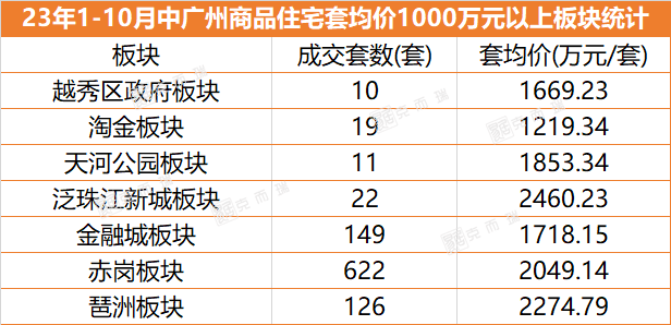 由上表可以得知,今年1-10月中广州共有3个板块套均价在2000万元以上,最高的是赤岗板块,套均价2274万元,泛珠江新城位居第二位,套均价2460万元,第三位是赤岗板块以套均价2049万元次之。