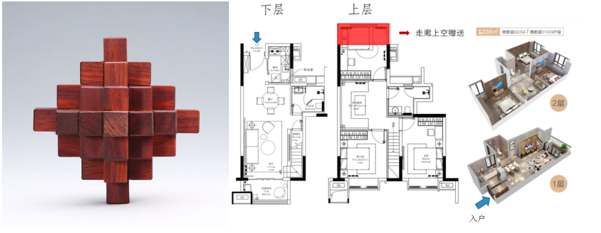 以方直香山墅项目为例,针对于特有条件,方直充分总体规划上,以点、板式接合的方式,实现有限空间的资源较大化,保障的所有住户的资源均好性。在建设中,香山墅采用创新型板式户型,用搭积木的方式,通过奇、偶层左右和上下层的同时咬合,让户与户之间形成不同立体空间体验,实现了2栋8户变2栋4户的立体空间。