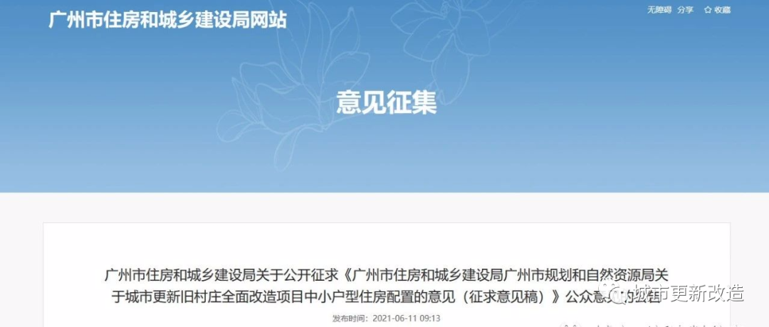 6月11日,广州市住房和城乡建设局发布关于公开征求《广州市住房和城乡建设局广州市规划和自然资源局关于城市更新旧村庄全面改造项目中小户型住房配置的意见(征求意见稿)》公众意见的公告。
