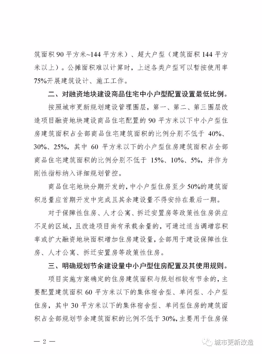 按照城市更新规划建设管理圈层,排名前列、第二、第三圈层改造项目融资地块建设商品住宅配置的90平方米以下中小户型住房建筑面积占全部商品住宅建筑面积的比例分别不低于40%、30%、25%。