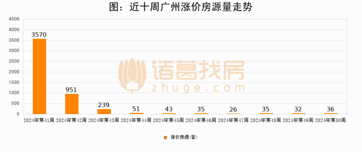 从调价房源来看,第50周广州涨价房源36套,较上周上涨12.5%。与此同时,50周涨价房源占比提升1.1个百分点,业主信心持续恢复。