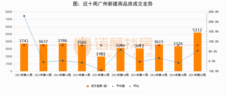 进入2024年第50周(12月09日-12月15日),广州新建商品房成交5212套,较上周增加1836套,环比上涨54.4%