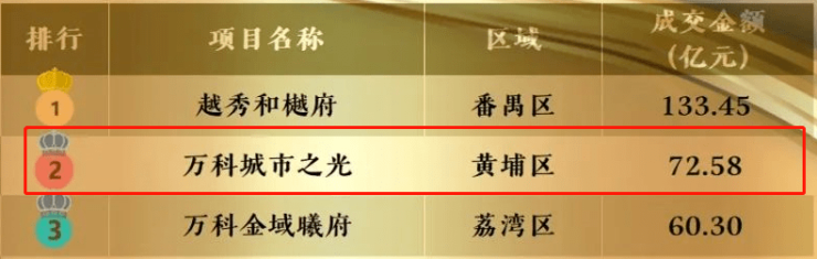 据克尔瑞公布的2022年广州前三季度销售金额排行榜中,万科城市之光排名第二,成交金额72.58亿!