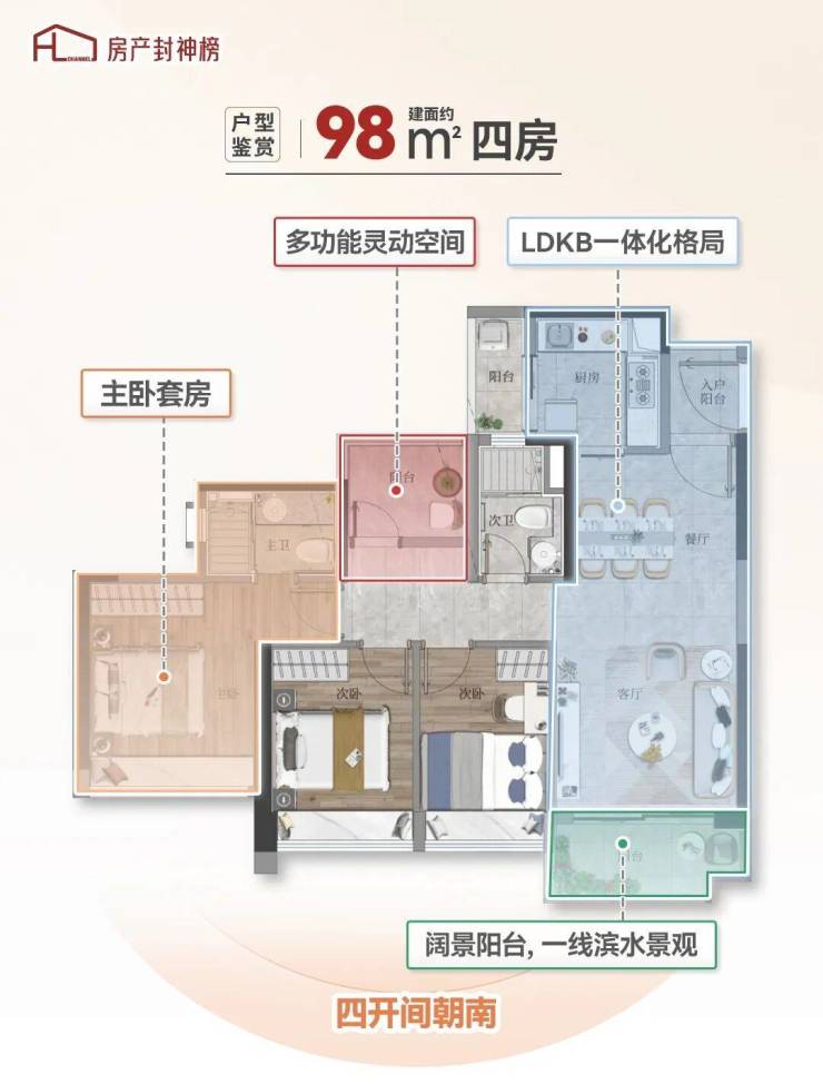 东南单边位,四开间朝南,引阳光清风入室;南北双阳台设计,一面安放生活,一面犒赏人生;南向阔景阳台,直望雅瑶河;LDKB 一体化方厅设计,打破空间界限,动线流畅,增强家庭互动性。