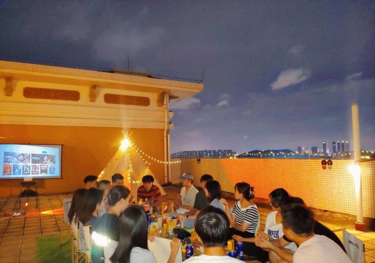 再比如龙湖集团旗下租赁住房品牌“冠寓”,今年6月就在广州、深圳、珠海、厦门、南京等全国众多城市的门店,组织了一场“天台露营节”:年轻的租户们在各个城市的冠寓天台上,搭起一顶顶天幕,准备好各式美食、饮料,再架上电影幕布、装点上鲜花,氛围感十足。
