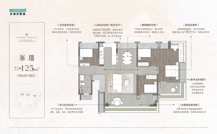 建面约 125㎡峯璟户型,拥有约 12 米的南向面宽,带来 IMAX 级别的采光效果,让阳光肆意倾洒入室。近 60㎡的 LDKGX 无界方厅,开放式的中西双厨与社交空间无缝衔接,既能满足业主举办米其林级家宴的需求,又能成为亲子烘焙的欢乐工坊。约 8.4m的 “超跑级” 阳台,270° 寰幕视野将珠江蜿蜒水景与 CBD 天际线尽收眼底,无论是清晨的第一缕阳光,还是傍晚的落日余晖,都能在此留下美好的记忆。