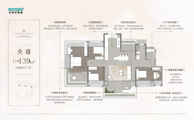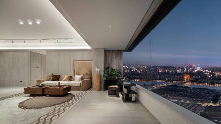 建面约 139㎡央璟户型,更是以其奢华的空间布局和贴心的细节设计,成为多代改善型家庭的首选。双主卧套房设计,充分关照每一位家庭成员的居住需求。南向长辈房配备独立卫浴与观景飘窗,保障老人生活的私密性与舒适度;主卧套房面积达 31㎡,步入式衣帽间可陈列各种高定服饰,满足业主对品质生活的追求。270° 环幕飘窗将珠江潮水与城市地标框成窗前巨幕,让业主每晚都能与星空和都会灯火相伴入眠。入户玄关花园以绿植造景,开启温馨归家仪式。