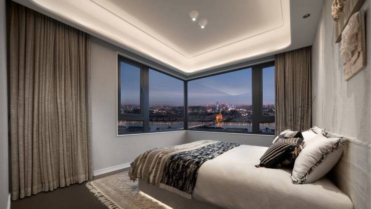 主卧套房配备 L 型环景飘窗,不仅增加了空间的通透感,更让业主在享受江风与美景的同时,拥有了一片属于自己的私密天地。全明卫浴系统采用酒店式干湿分离设计,彰显品质与舒适。