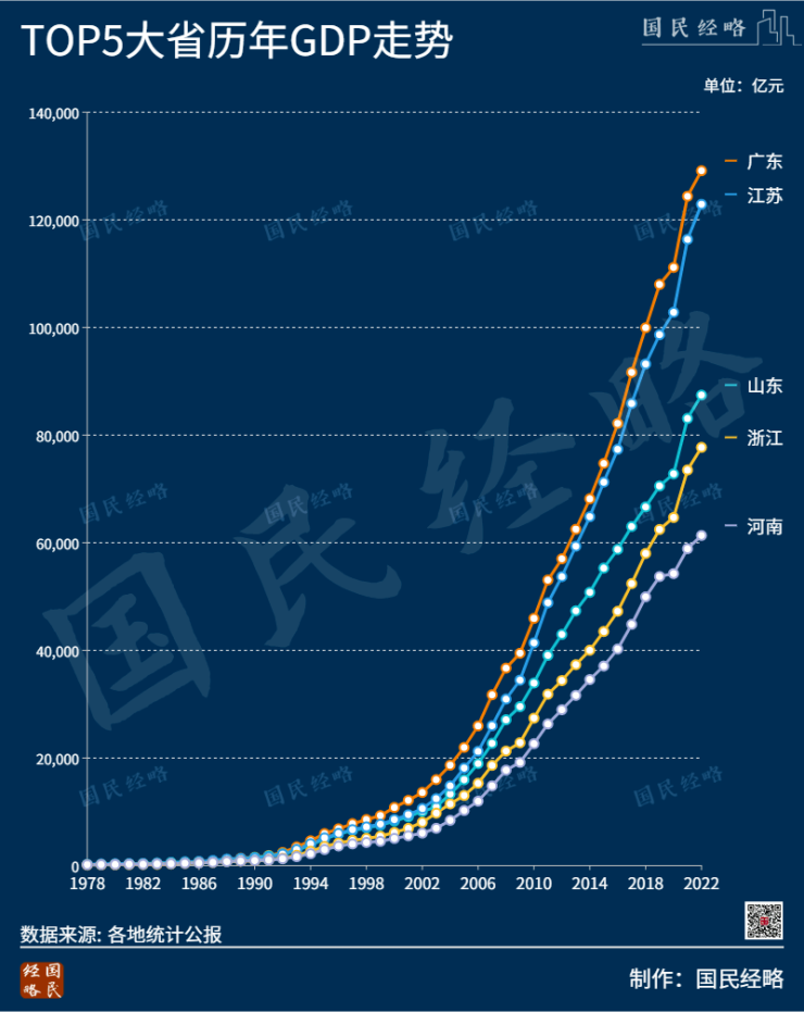 作为我国仅有的两个10万亿级大省,广东、江苏经济总量仍旧遥遥领先。广东已经连续34年位居全国首位,而江苏则是连续30年位居全国第二。