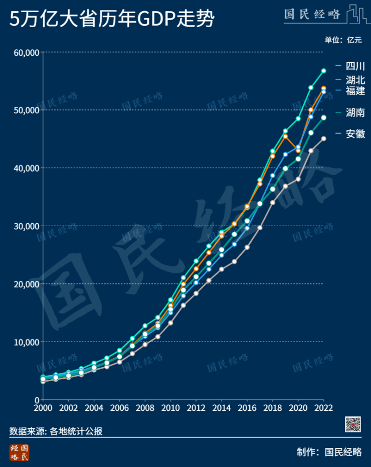 不过,福建在2021年被湖北反超之后,2022年正在加速逼近,两省差距不到1000亿元,与四川的差距也在进一步收窄。