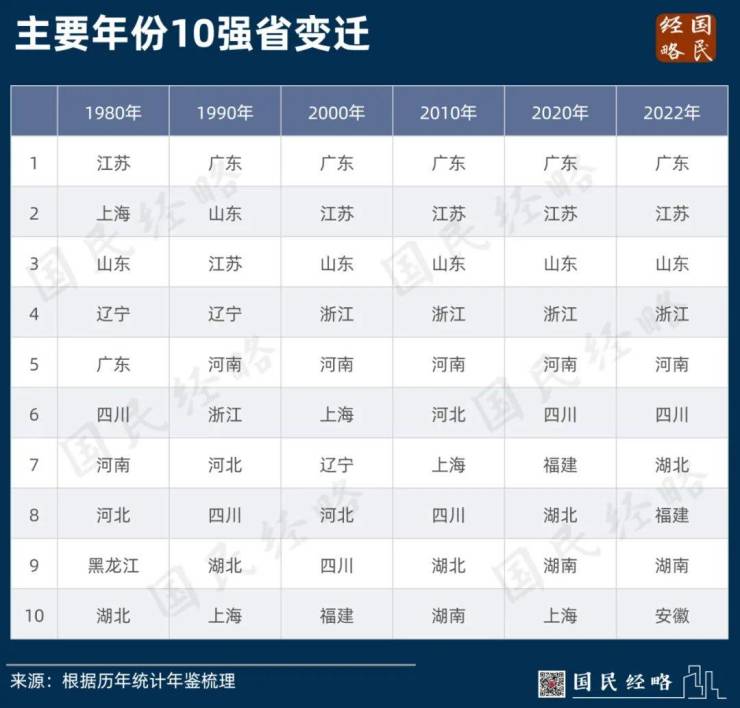 过去10年来,中国十强省迎来多次洗牌,除了粤苏鲁稳居前列外,辽宁、黑龙江、河北、上海等省份先后退出,福建、湖南、安徽等地脱颖而出。