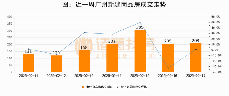 根据广州市住房和城乡建设局数据显示,2025年02月17日广州新建商品房成交208套,较昨日增加3套,环比上涨1.5%