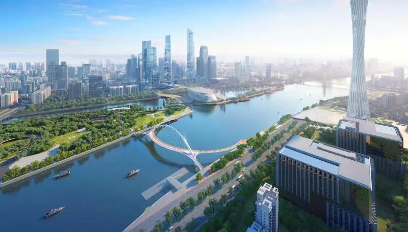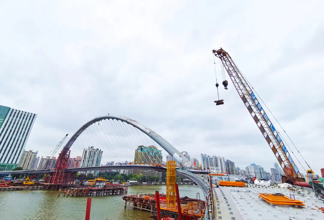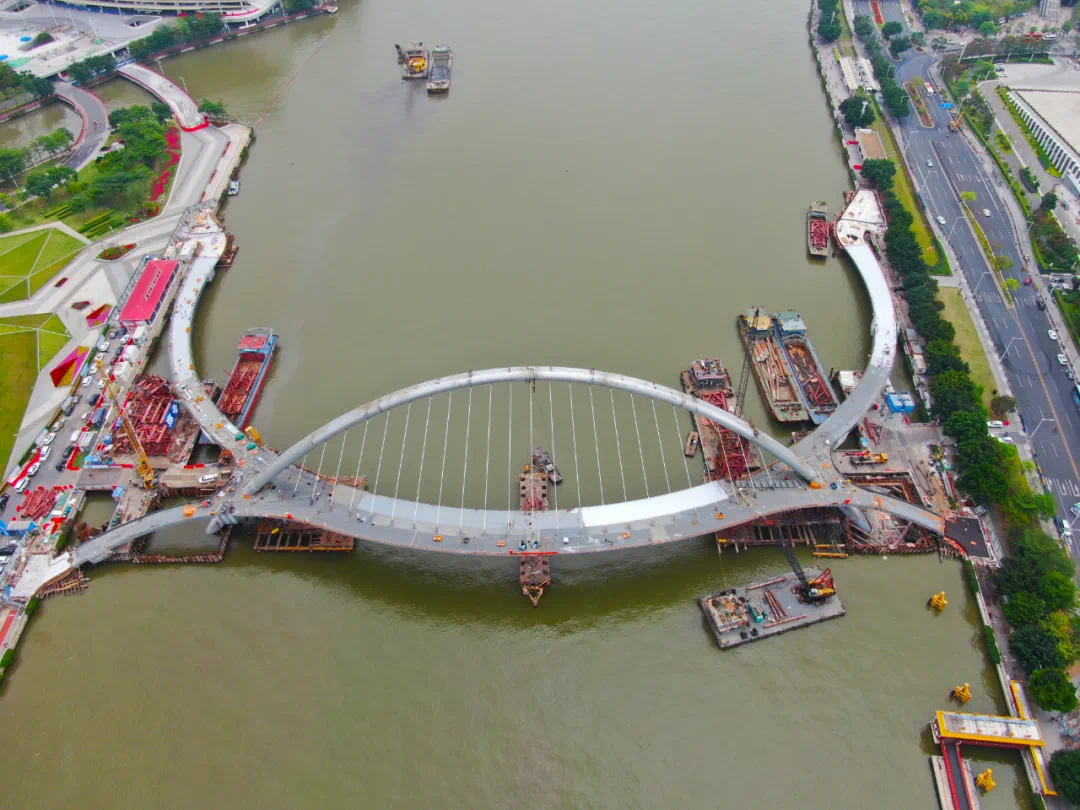 近日,位于广州中轴线、横跨珠江两岸的广州人行桥最后一根钢梁支架顺利拆除,标志着该桥施工体系顺利完成转换,向着如期完工目标奋力冲刺,一张展示广州城市魅力的新名片即将建成。