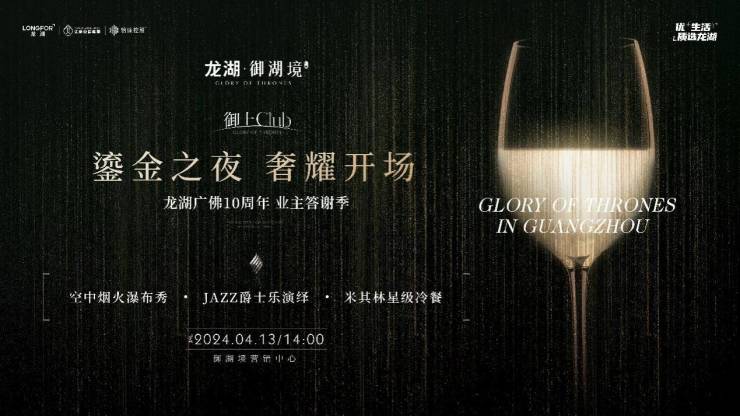 值此龙湖广佛10周年之际,龙湖·御湖境御上CLUB业主答谢季,4月13日鎏金之夜,奢耀开场,致谢业主,空中烟火瀑布秀、JAZZ爵士乐演绎、米其林星级冷餐,敬献城市层峯。