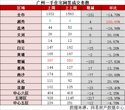 外围五郊区依然是成交主力,上周共计成交928套,中心六区则成交404套。增城夺得销冠,共成交397套。