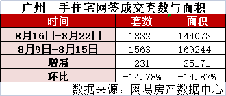 阳光家缘数据显示,上周(8月16日-8月22日)广州一手楼网签成交1332套,环比上上周(8月9日-8月15日)的1563套减少231套,环比下降14.78%。