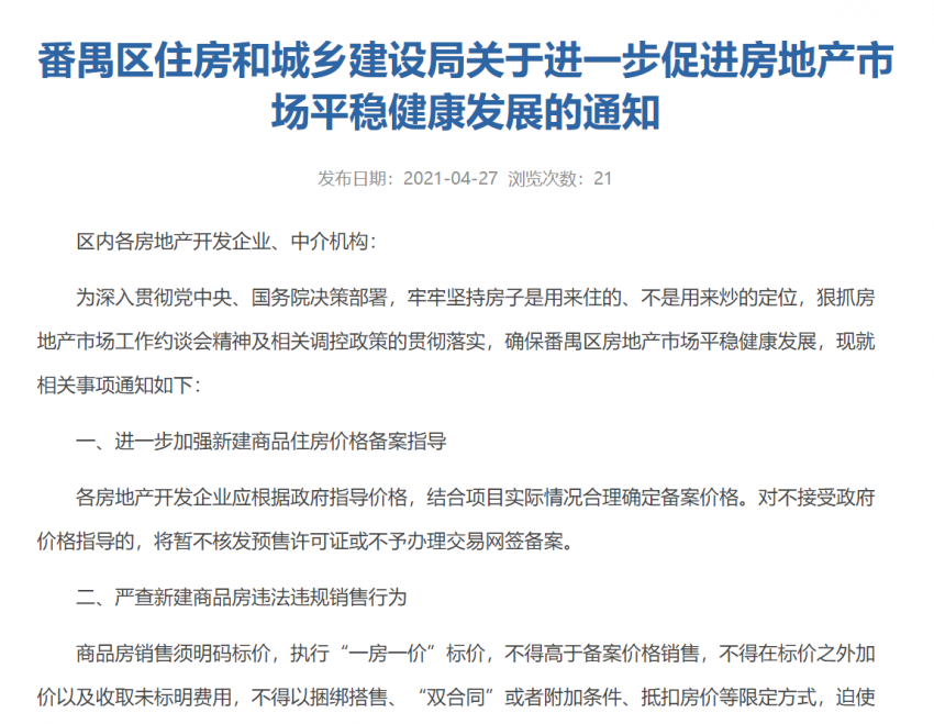 2021年4月27日,番禺区住房和城乡建设局发布了《关于进一步促进房地产市场平稳健康发展的通知》。