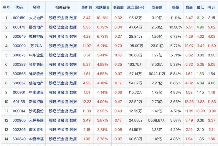 下午涨势得到持续,截至A股房地产开发板块收盘,大龙地产涨幅10.16%,城投控股涨6.73%,万科A涨6.215,中华企业涨5.41%,金地集团涨4.98%,信达地产涨4.16%,新城控股涨4.0%等。