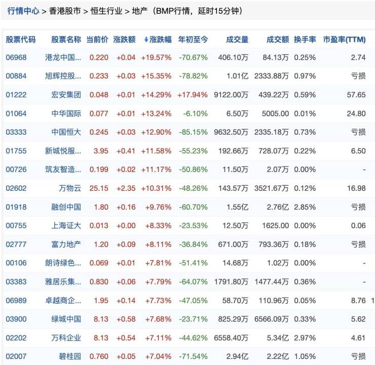 港股方面,截至发稿,港龙中国涨幅19.57%,旭辉控股涨幅16.34%,中国恒大涨12.9%,融创中国涨幅8.54%,雅居乐涨7.79%。