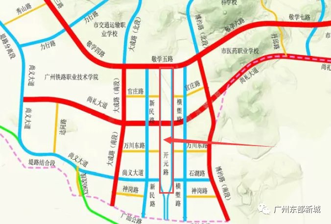 2、开元路工程:南北走向,位于中轴广场两侧,南起广汕公路,北止敬学路,东线沿线分别与石湖路、万川东路、尚礼大道、官庄路等道路平交,西线沿线分别与尚义大道、万川东路、尚礼大道、官庄路等道路平交,交叉口间距约290m,长约1.46km,按城市次干路标准建设,设计速度为40km/h,红线宽度为30m,双向四车道。