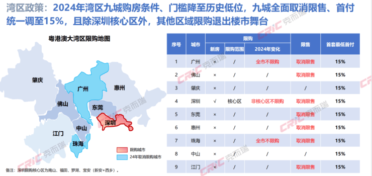 聚焦到湾区九城政策端上,克而瑞监测到,2024年湾区九城购房条件、门槛降至历史低位,九城全面取消限售、首付统一调至15%,且除深圳核心区外,其他区域限购退出楼市舞台。