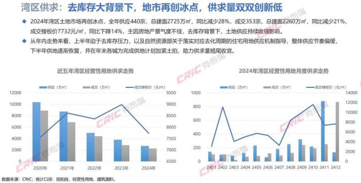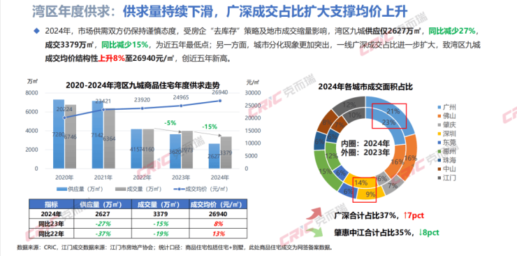 克而瑞数据监测显示,2024年最终录得湾区九城商品住宅供应仅2627万㎡,同比减少27%,成交3379万㎡,同比减少15%,为近五年最低点;另一方面,城市分化现象更加突出,一线广深成交占比进一步扩大,致湾区九成交均价结构性上升8%至26940元/㎡,创近五年新高。