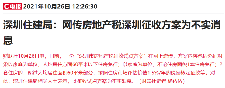 深圳住建局:网传房地产税深圳征收方案为不实消息