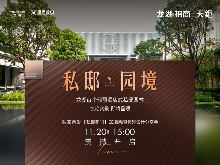 据悉,龙湖招商·天鉅匠心打造的龙湖排名前列瑰丽酒店式私邸园林,惊艳实景绽放在即,并于11月20日(本周六)提前举办私邸园林3D视频暨景观设计分享会,与业主客户进行多方面的深入分享和交流。