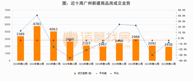 进入2025年第34周(08月18日-08月24日),广州新建商品房成交1938套,较上周减少154套,环比下降7.4%