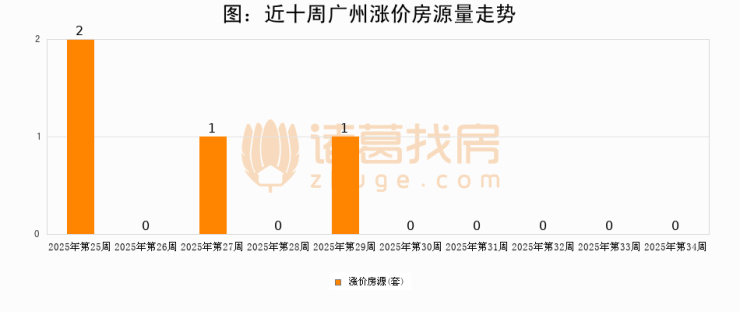 从调价房源来看,第34周广州涨价房源0套,较上周持平。与此同时,34周涨价房源占比持平