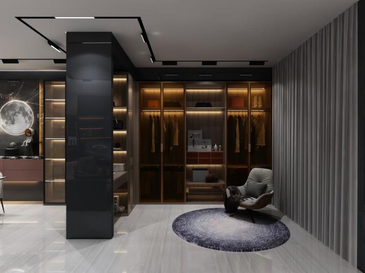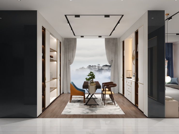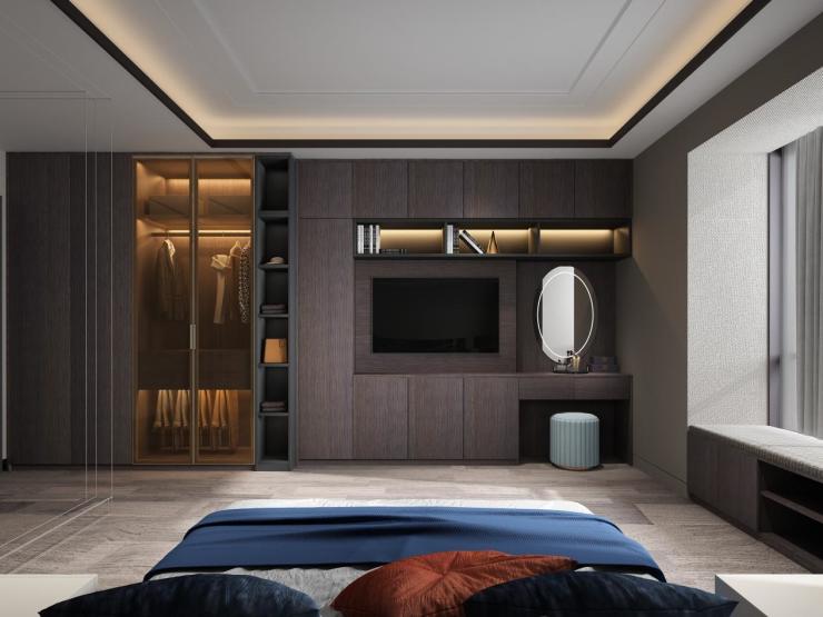 简洁的L型衣帽间充分利用了室内空间,科学合理的分区,让四季衣物井然有序。独立的梳妆台让女主人更能愉悦地享受变美时光。深棕色的木质纹理和仿生态的大理石纹设计相得益彰,低调之中尽显高贵、优雅气质。爱玛仕橙的抽屉,则在前二者营造的雅致奢华之中增添了恰到好处的活泼动感,令人眼前一亮、百看不厌。时尚、经典的设计也贯穿于诸多细节之上,茶色的玻璃门大大提升了空间的通透质感,细长的五金拉手让开合更便捷。对于细节的专注与考究,令使用者尽享尊贵舒适体验。