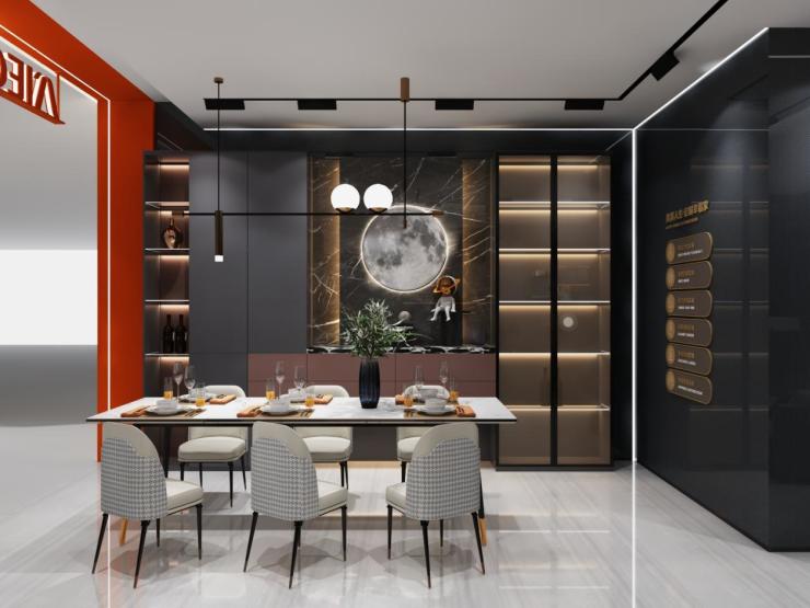 视,汲取流星星雨石的设计灵感,在背景墙及台面大量运用,仿大理石效果是点缀,却更显高级;触,肤感饰面如婴儿肌肤般细腻丝滑,搭配灰金色烤漆面板,重新演绎时尚未来感;品,干练、流畅的线条,几何图形+悬浮式产品混搭,太空的失重感与科技感扑面而来,恣意遨游在未来之境。