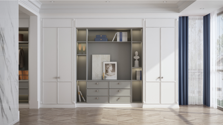 生活本该具有仪式感。温莎时代采用经典欧式罗马柱元素设计,柜体以月牙白为主基调,局部开放格以天际哑灰搭配,哑光饰面手感细腻舒适,耐磨耐刮;整体淡雅色系高级且耐看,丰富空间的层次感,鲜明对比营造暖意居家氛围,精致而不失灵性,诠释有温度的家。