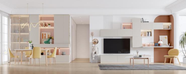 整个莫兰迪系列以清新的天云灰和自然原色的蝶恋枫为主调,令整个空间看起来温暖而又不失高级格调。柔美的珊瑚粉作为点缀,增添灵动之感和活泼气质。简约的设计,合理的动线,再搭配淡雅色系的家居用品,自然和谐的家庭氛围呼之欲出,风格可咸可甜,自由不受限。