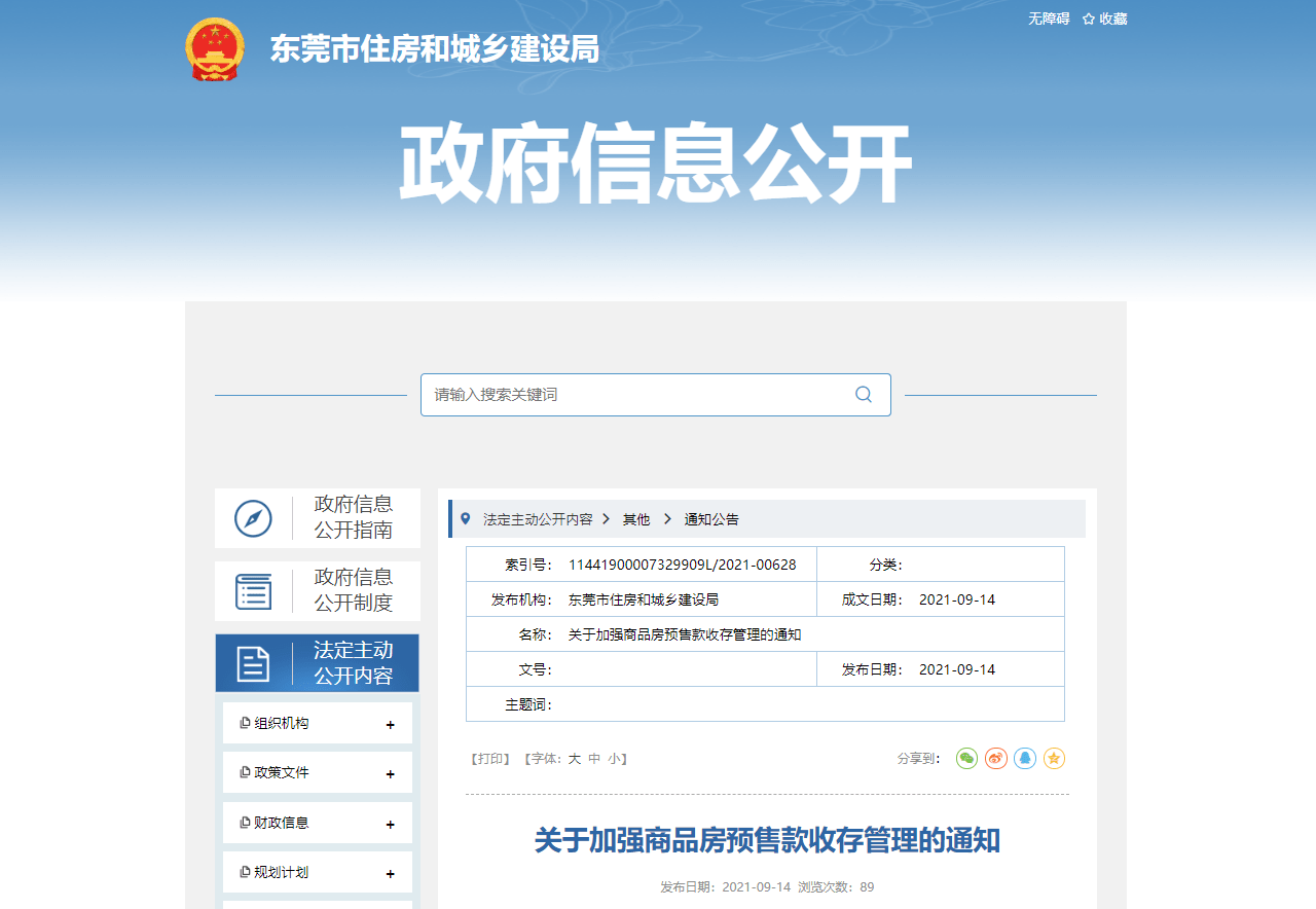 9月14日,东莞市住房和城乡建设局官网发布《关于加强商品房预售款收存管理的通知》(下称《通知》)。