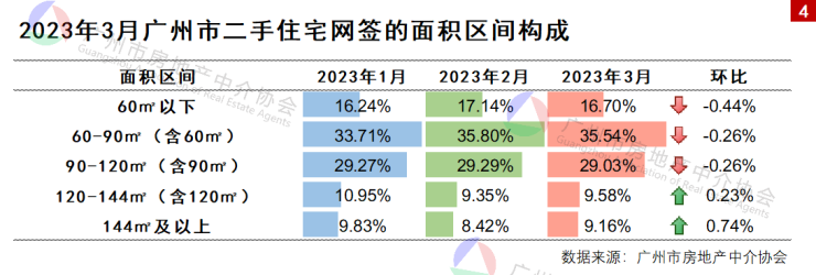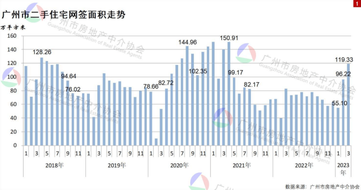 3月份广州的二手房整体成交数据亦较为乐观,网签宗数创下2021年5月以来的新高。数据显示,3月(统计周期为2月26日至3月25日,下同),广州市二手住宅整体(中介促成+自行交易)网签宗数和面积分别为12260宗和119.33万平方米,环比增长23.36%和24.02%,同比增长45.73%和44.12%。