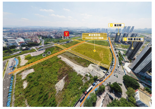 黄金围东区AB2401061地块距离地铁滘心站约300米,临近广清高速、华南快速,驾车可快速到达广州白云国际机场、广州火车站等重要功能片区。地块北侧紧邻培英学校白云湖校区(九年一贯制),另2000米内有朝阳小学、鸦岗小学及多所规划中小学,附近有万民百货、标达广场、广安医院、白云湖公园等,配套一应俱全。