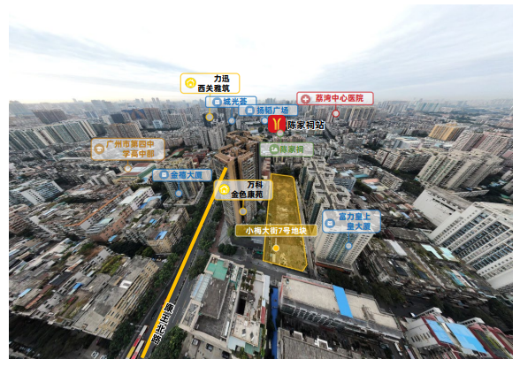 小梅大街7号地块地处地铁1号线、8号线、11号线、13号线沿线,距彩虹桥站、陈家祠站500米,邻近芳村大道-东沙大道、环城高速,驾车30分钟可到达白鹅潭商务核心区、广州南站、琶洲商务区、佛山市区等重要功能片区。