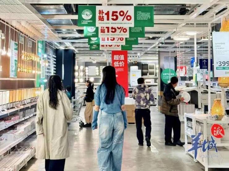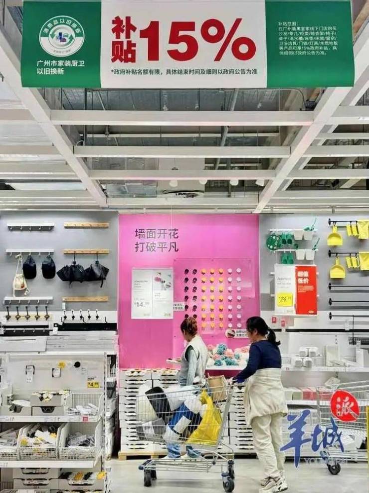 3月5日,记者走访广州宜家相关商场发现,“以旧换新”补贴15%广告牌随处可见。相关工作人员介绍,今年宜家参与家装厨卫“焕新”补贴的品类数量大幅增加,数千款产品可以享受国补,部分精选好物能享受加码优惠。此外,宜家近期还上线了回购和再售服务,让市民以更实惠的方式实现“以旧换新”。
